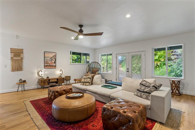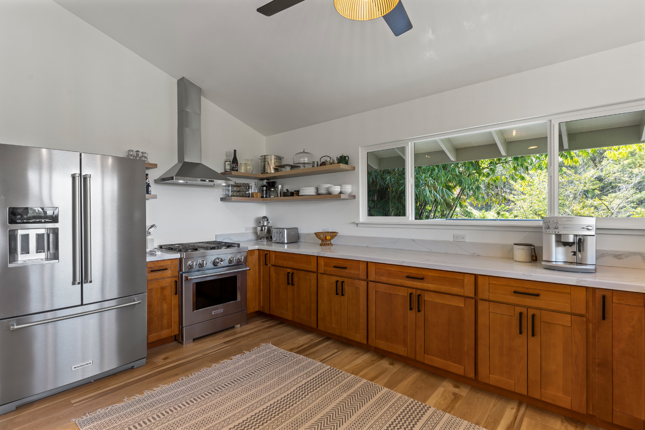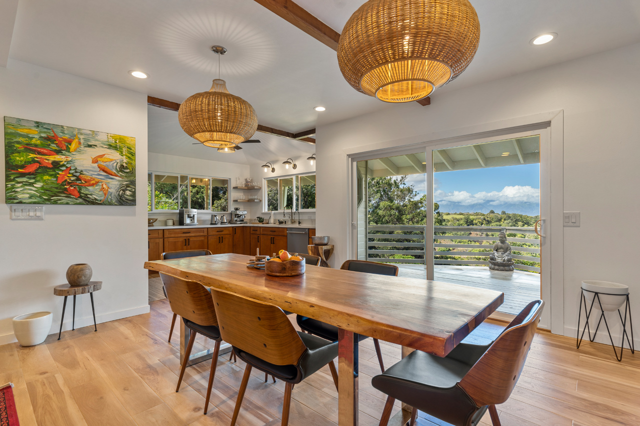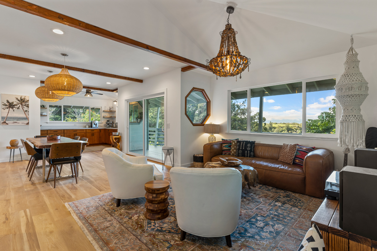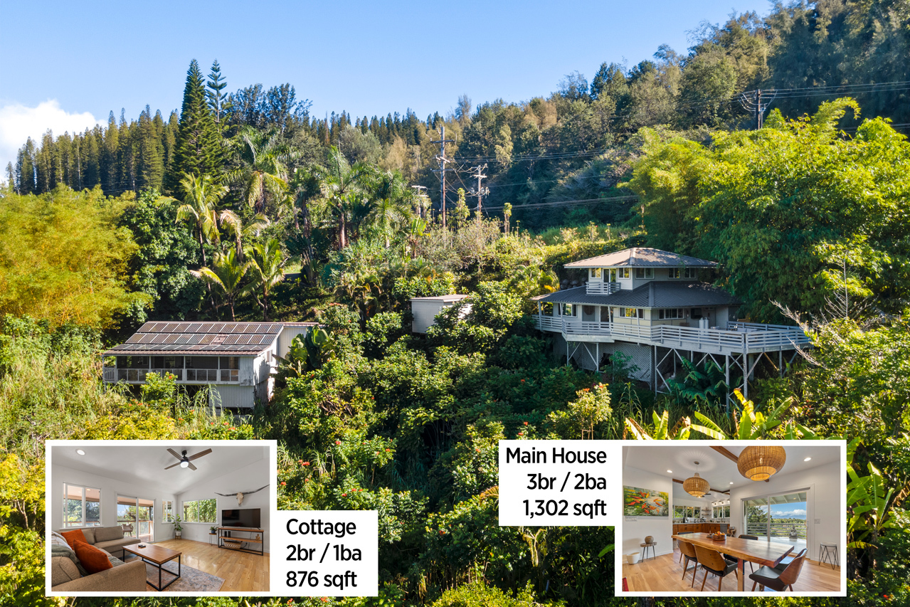 Epic ocean and mountain views from this extraordinary Haiku estate. “Town and Country” best describes 1660 Kokomo Rd. which features fully renovated residences on over 2 acres of peaceful nature and paradise. From the moment you set foot on the property, you will be instantly captivated by the vibrantly lush and tropical foliage with plentiful mature trees overlooking Maliko Gulch. There is a great separation of space between the 3bd/2ba main home and the detached 2bd/1ba accessory dwelling on the property. This is the perfect setup for multi generation living, a successful rental property, or an upcountry flower farm. The home is fully equipped with a seller owned photovoltaic system for both the main house and the cottage. The great room of the main home speaks volumes for the seller’s pride of design and ownership. This space exudes an incredible warmth with all of the natural wood textures that bring in the outdoor jungle vibes. The spacious and contemporary kitchen is well positioned with easy access to the great room and central hallway. Recent renovations include all new flooring, high energy efficient stainless steel appliances, white quartz countertops, and open shelves above the kitchen counters that will inspire artful cooking. Wood-plank vinyl flooring and freshly painted white walls accentuate the spacious feeling of the home which includes 3 bright bedrooms, 2 full baths, and a bonus room. All of the bedrooms have numerous windows allowing for solid ventilation and light. The large lanai of the main home is really an extension of your living interior which provides an extra space that blends nicely to indoor/outdoor living arrangement. The ohana features a gorgeous, lush, tropical view from its 300 sq ft covered, screened in lanai. The location of 1660 Kokomo is exceptionally convenient to both the Haiku Cannery Marketplace and Historic Makawao Town. Lots of nearby restaurants, food trucks, art galleries, fine boutiques, and overall upscale amenities. The Montessori School of Maui, Seabury Hall Preparatory Academy, and Ho'okipa Beach Park are all within a 10 minute drive of this property. Finely appointed and being offered fully furnished by the sellers.