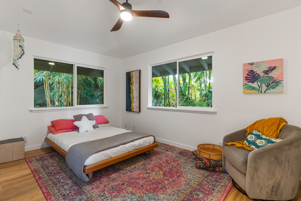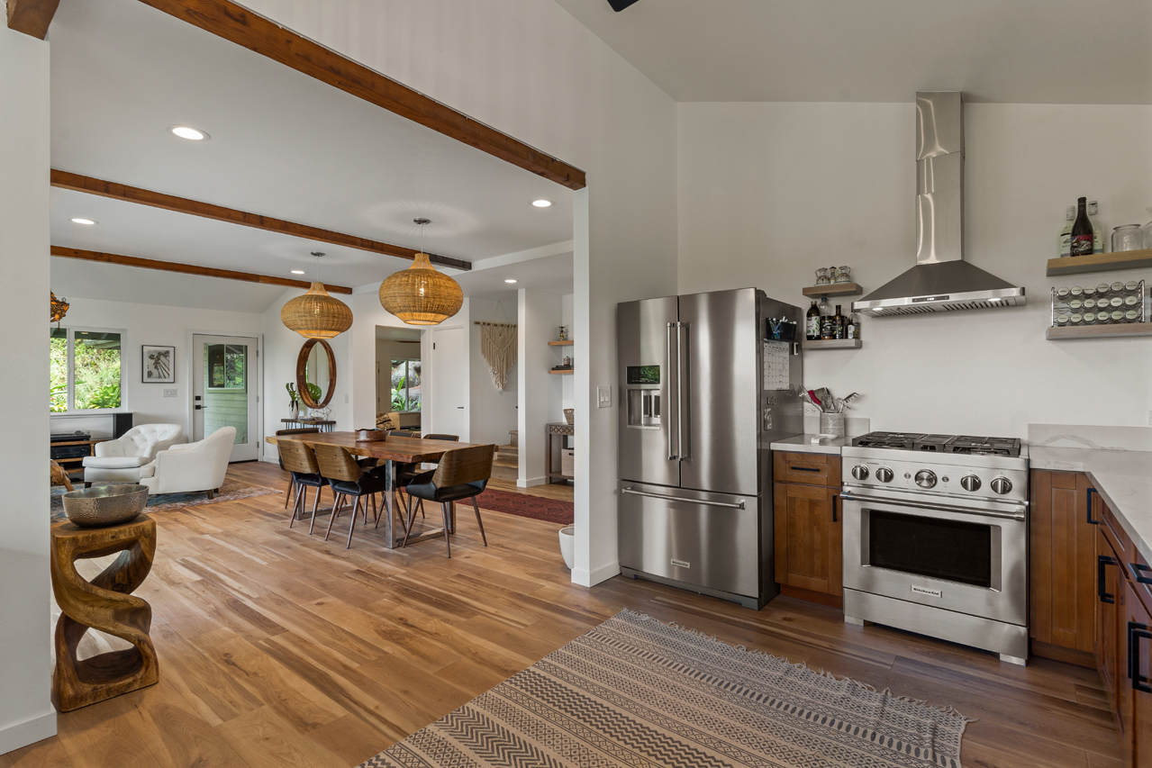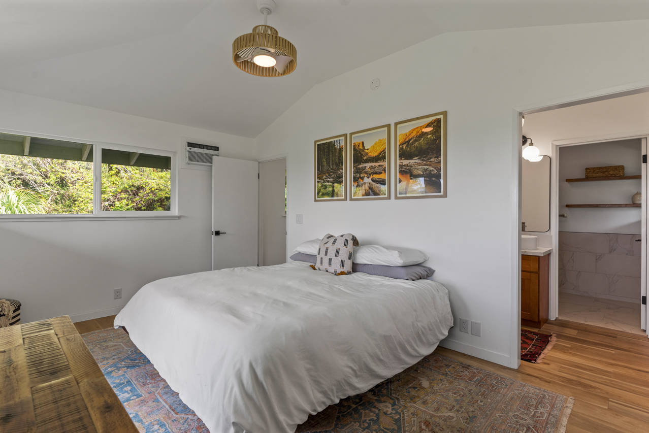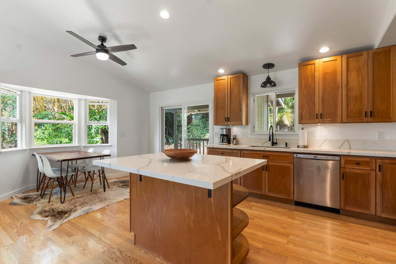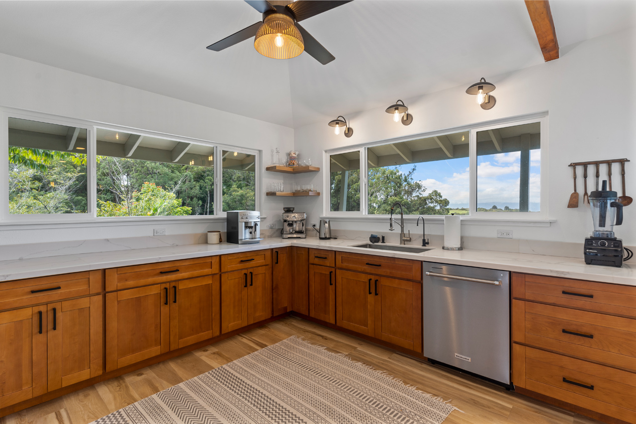 Epic ocean and mountain views from this extraordinary Haiku estate. “Town and Country” best describes 1660 Kokomo Rd. which features fully renovated residences on over 2 acres of peaceful nature and paradise. From the moment you set foot on the property, you will be instantly captivated by the vibrantly lush and tropical foliage with plentiful mature trees overlooking Maliko Gulch. There is a great separation of space between the 3bd/2ba main home and the detached 2bd/1ba accessory dwelling on the property. This is the perfect setup for multi generation living, a successful rental property, or an upcountry flower farm. The home is fully equipped with a seller owned photovoltaic system for both the main house and the cottage. The great room of the main home speaks volumes for the seller’s pride of design and ownership. This space exudes an incredible warmth with all of the natural wood textures that bring in the outdoor jungle vibes. The spacious and contemporary kitchen is well positioned with easy access to the great room and central hallway. Recent renovations include all new flooring, high energy efficient stainless steel appliances, white quartz countertops, and open shelves above the kitchen counters that will inspire artful cooking. Wood-plank vinyl flooring and freshly painted white walls accentuate the spacious feeling of the home which includes 3 bright bedrooms, 2 full baths, and a bonus room. All of the bedrooms have numerous windows allowing for solid ventilation and light. The large lanai of the main home is really an extension of your living interior which provides an extra space that blends nicely to indoor/outdoor living arrangement. The ohana features a gorgeous, lush, tropical view from its 300 sq ft covered, screened in lanai. The location of 1660 Kokomo is exceptionally convenient to both the Haiku Cannery Marketplace and Historic Makawao Town. Lots of nearby restaurants, food trucks, art galleries, fine boutiques, and overall upscale amenities. The Montessori School of Maui, Seabury Hall Preparatory Academy, and Ho'okipa Beach Park are all within a 10 minute drive of this property. Finely appointed and being offered fully furnished by the sellers.