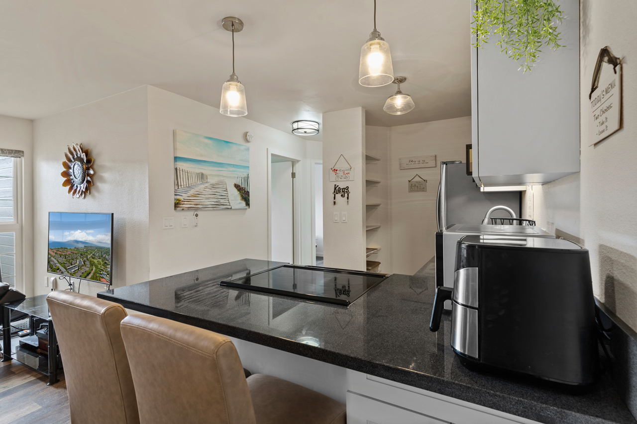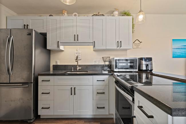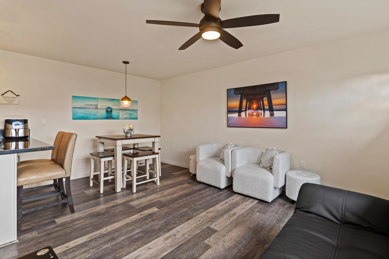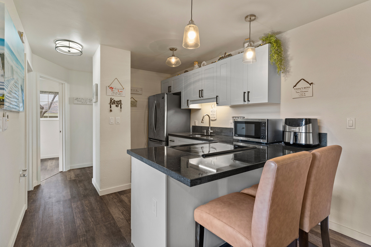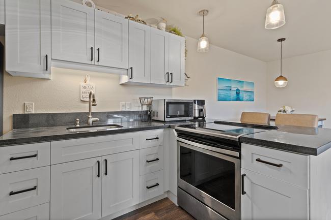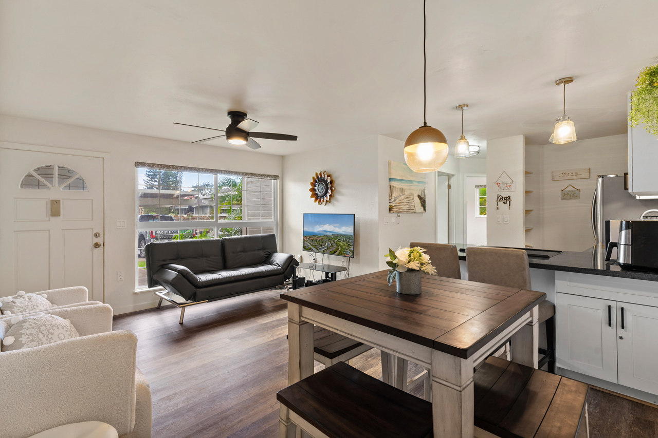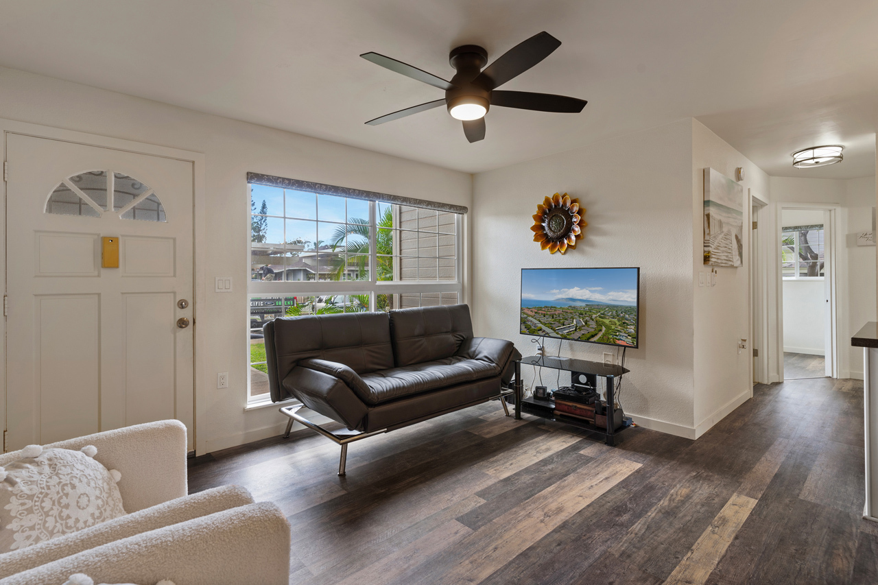 Welcome to this charming ground floor Keonekai Villages retreat in Kihei! One of the nicer remodels you will ever see in the community. This delightful 2 bedroom, 1 bath condo boasts a spacious and airy floor plan with plenty of natural light. You will love coming home to this beachy corner unit location which offers extra windows in both the primary bedroom & primary bathroom. The convenience of the ground floor location offers easy access to the outdoors and a tranquil garden view from the front door, creating a peaceful retreat for relaxing and entertaining. The bedrooms are generously sized, with ample closet space, and the bathrooms and the kitchen have been tastefully updated with modern finishes. There are so many things to love about this condo. Completely renovated in 2019 with new luxury vinyl plank flooring throughout. Kitchen remodel features custom cabinets accented with gray color granite stone countertops which extend to the breakfast bar. High energy efficient stainless steel appliance package; bathroom features a floating vanity countertop, new lights, toilet and tub with surround tile walls; all interior walls have been re-textured and repainted; contemporary look ceiling fans with remote control in all rooms; new water heater; popcorn ceilings removed; new baseboards and light switch covers, and more! Located in a prime South Maui location, just minutes from world-class beaches, shopping, dining, and entertainment, this is the perfect place to call home or use as a rental income property. Don't miss this opportunity to experience the best of Maui living!